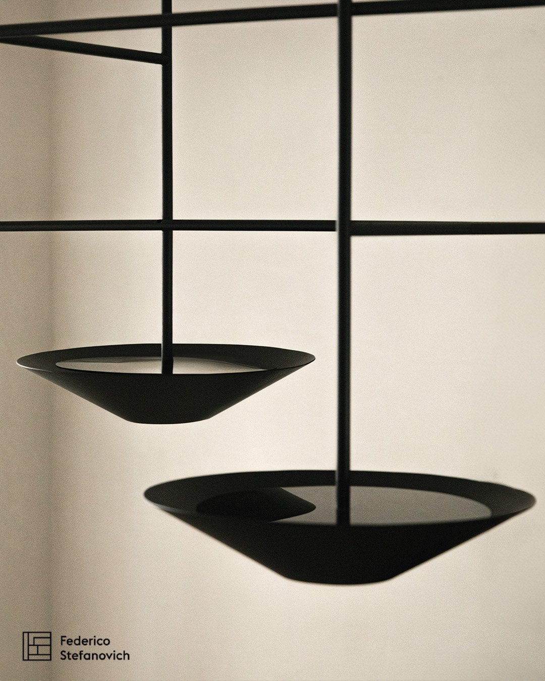 A sculptural lamp made of powder coated steel, created through traditional blacksmithing methods. Its light is soft and diffuse, illuminating the ceiling indirectly. It is composed of independent conical elements arranged in an apparently disordered manner, but achieving visual balance thanks to their orthogonal relationships.
