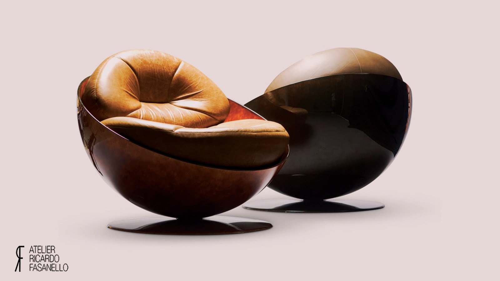 The truly original Esfera armchair. Constructed from fiberglass and polyester resin with leather upholstery, on a swivel base. Considered one of Ricardo Fasanello’s masterpieces, embodying Fasanello’s innovative exploration of materials and design philosophy. The bold form and sculptural beauty was influenced by 60s pop culture, a movement that continues to delight.