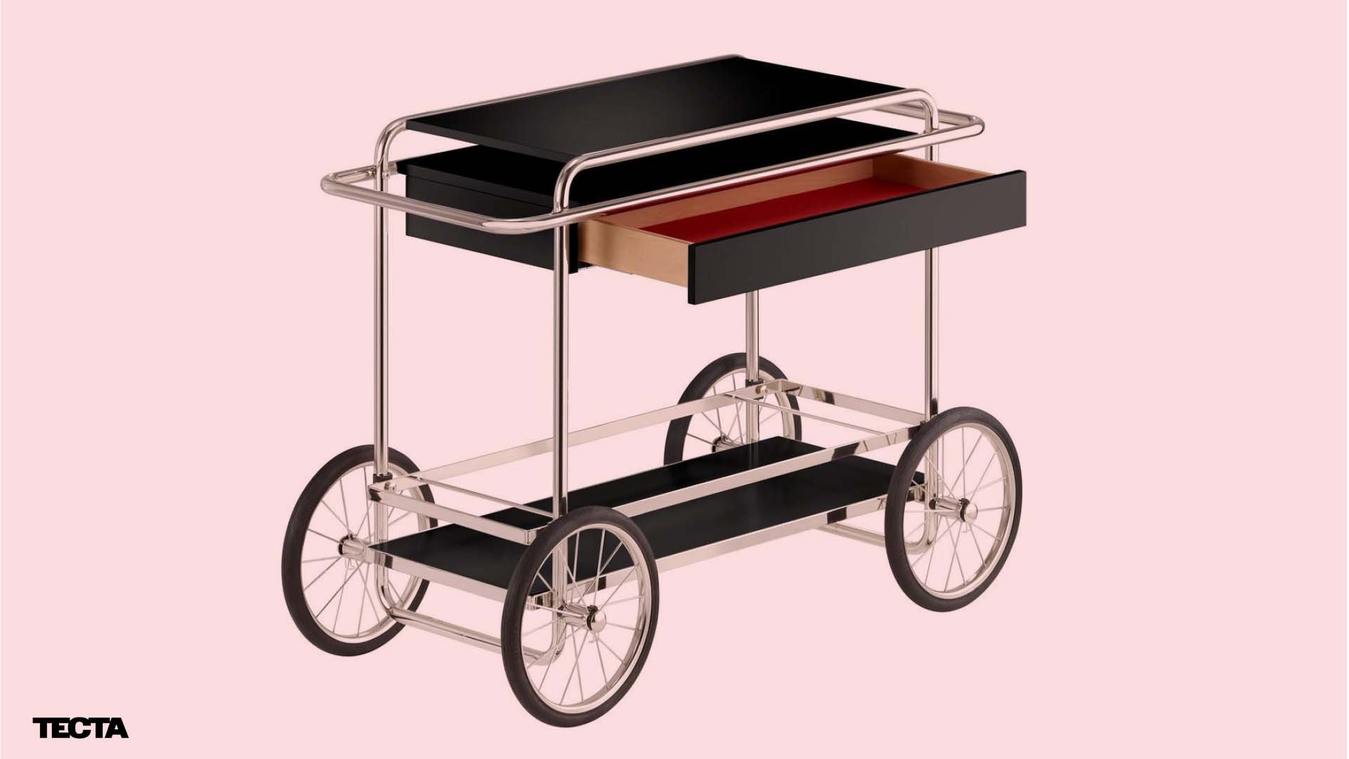 The M4R console trolley is Bauhaus on wheels. With its elegant tubular steel lines and four large spoked wheels it can be used as a drinks trolley or side table. Available in multiple colours; with or without a drawer and a bottle holder.