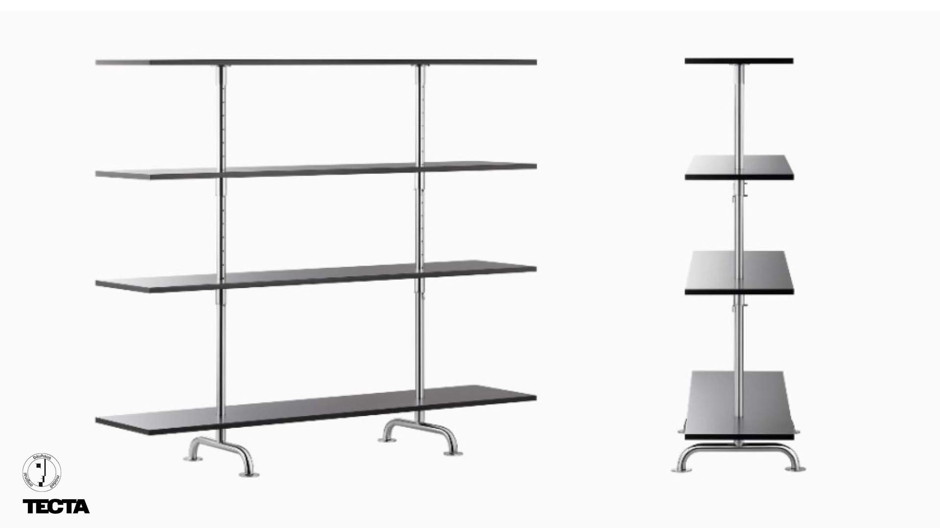 Marcel Breuer’s S44, designed in 1932. The four height-adjustable shelves are supported by a pair of chrome-plated tubular steel columns on wide-set feet.