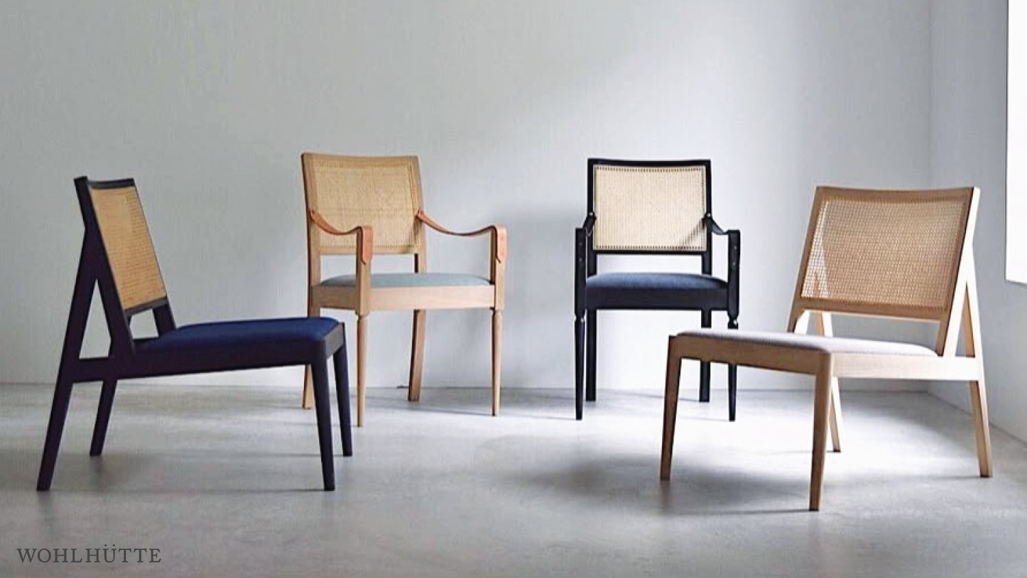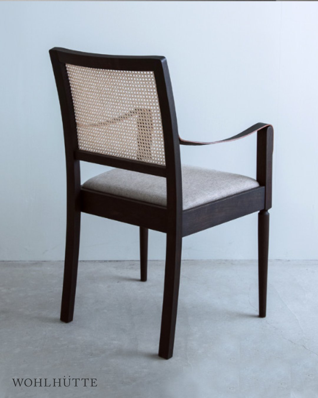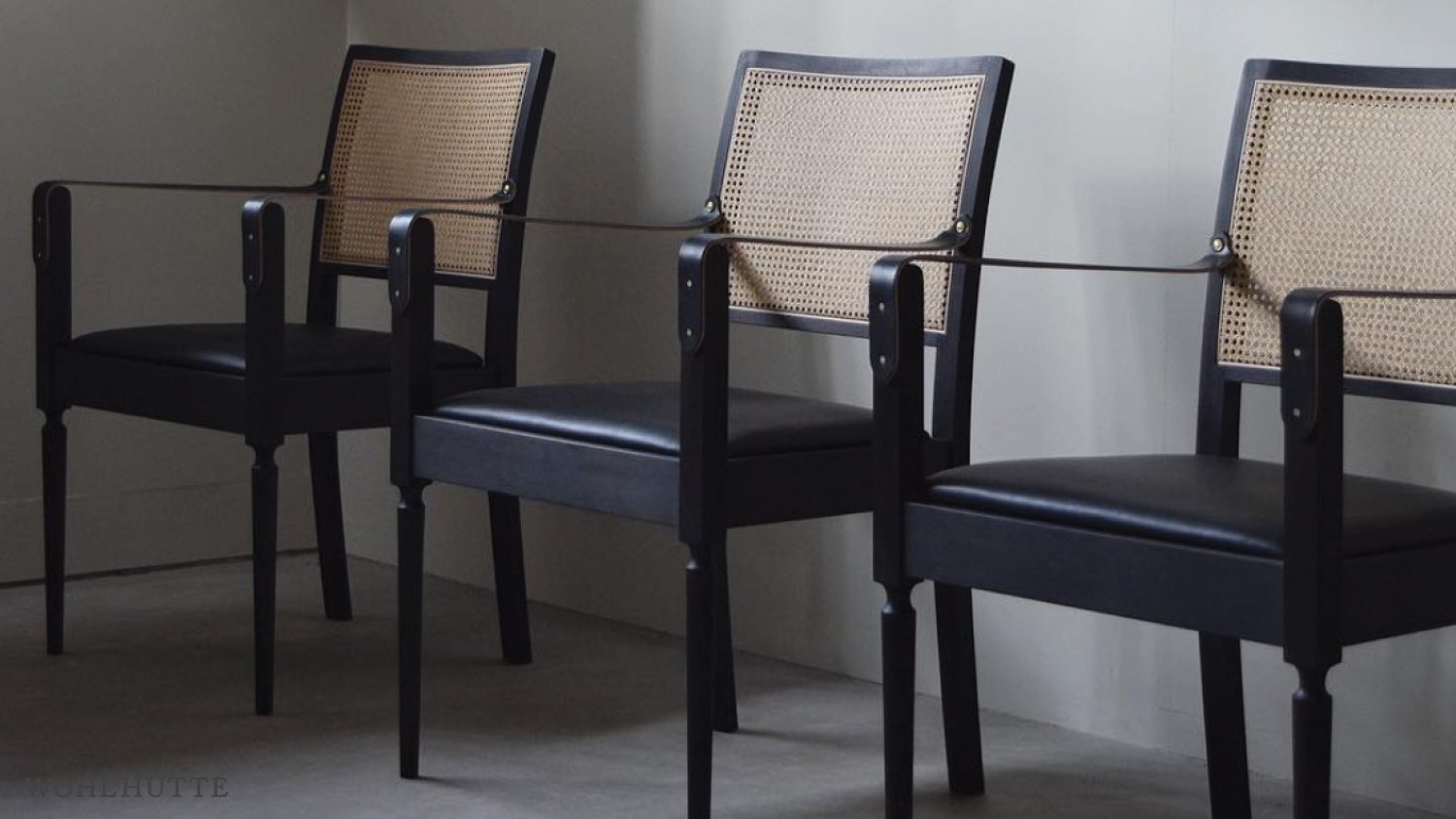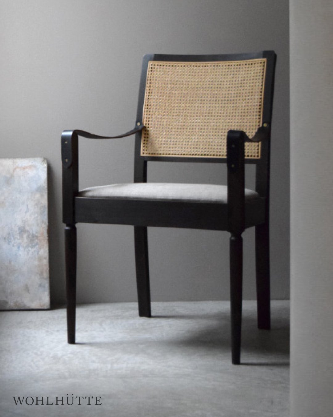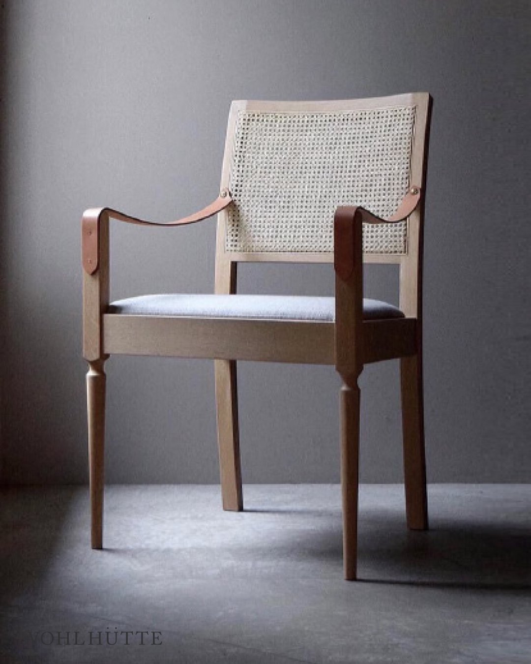 FINISH: Rattan. Japanese Oak finished in natural oil or black. Brass. FINISH: Leather armrests. Upholstery seat: Fabric (Kvadrat Herald 3 or Byram) or Leather (black or camel).